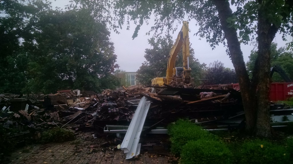 A close-up of the demolished Manse, its remains being picked up and hauled away to a landfill, on July 29, 2016, at 7 AM.