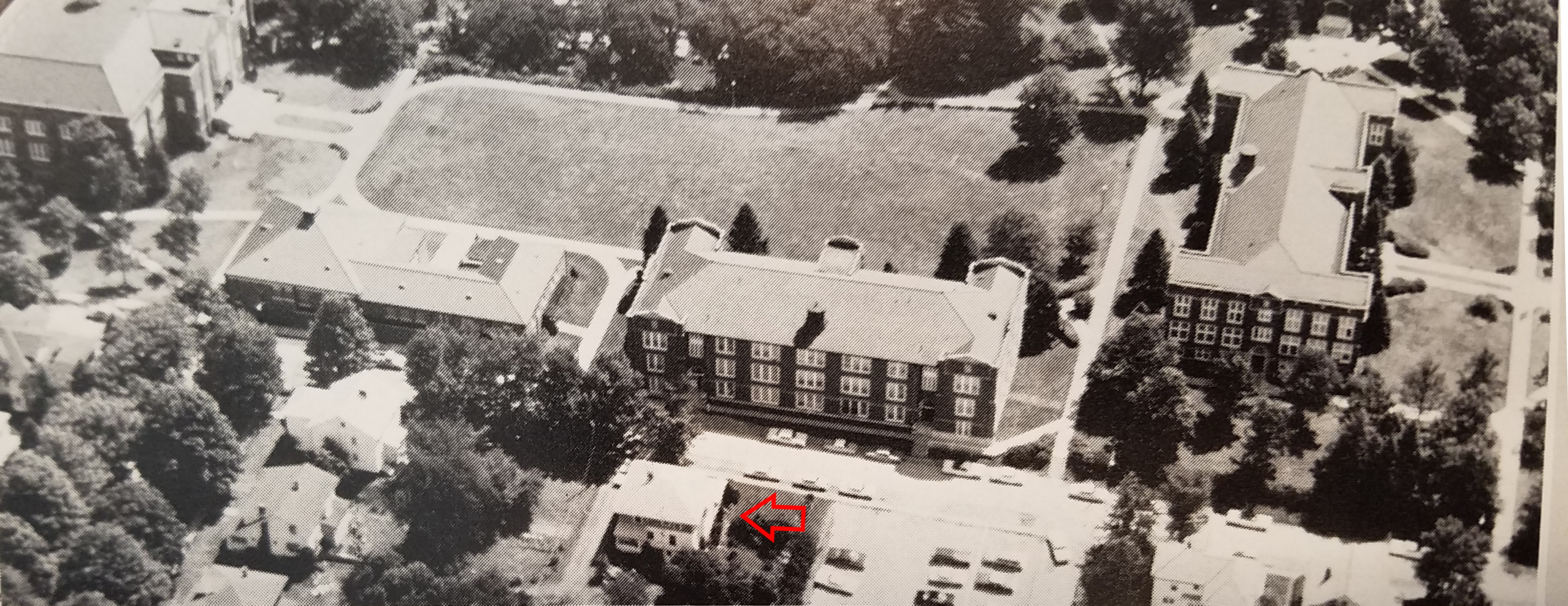 Beginning with the Presidency of Reverend J. Knox Montgomery, he ensured a Manse would be built for him and his family to reside in during his term, which lasted until the early 1930s. A garage would be built later on for storage of the automobile Montgomery drove, with it being accessible from College Drive. The Manse stood west of four houses, 7, 5, 3, and 1 College Pl. 7 College Pl was likely built prior to the Manse based on photographs taken before the Manse’s existence. 5 College Pl was a one-story cottage design built either late 1890s or early 1900s, with 3 and 1 College Pl being built mostly identically. Of the four houses, 5 College Pl is the poorest-documented due to it often being obscured by Johnson Hall, or poorly-contrasted aerial photos.